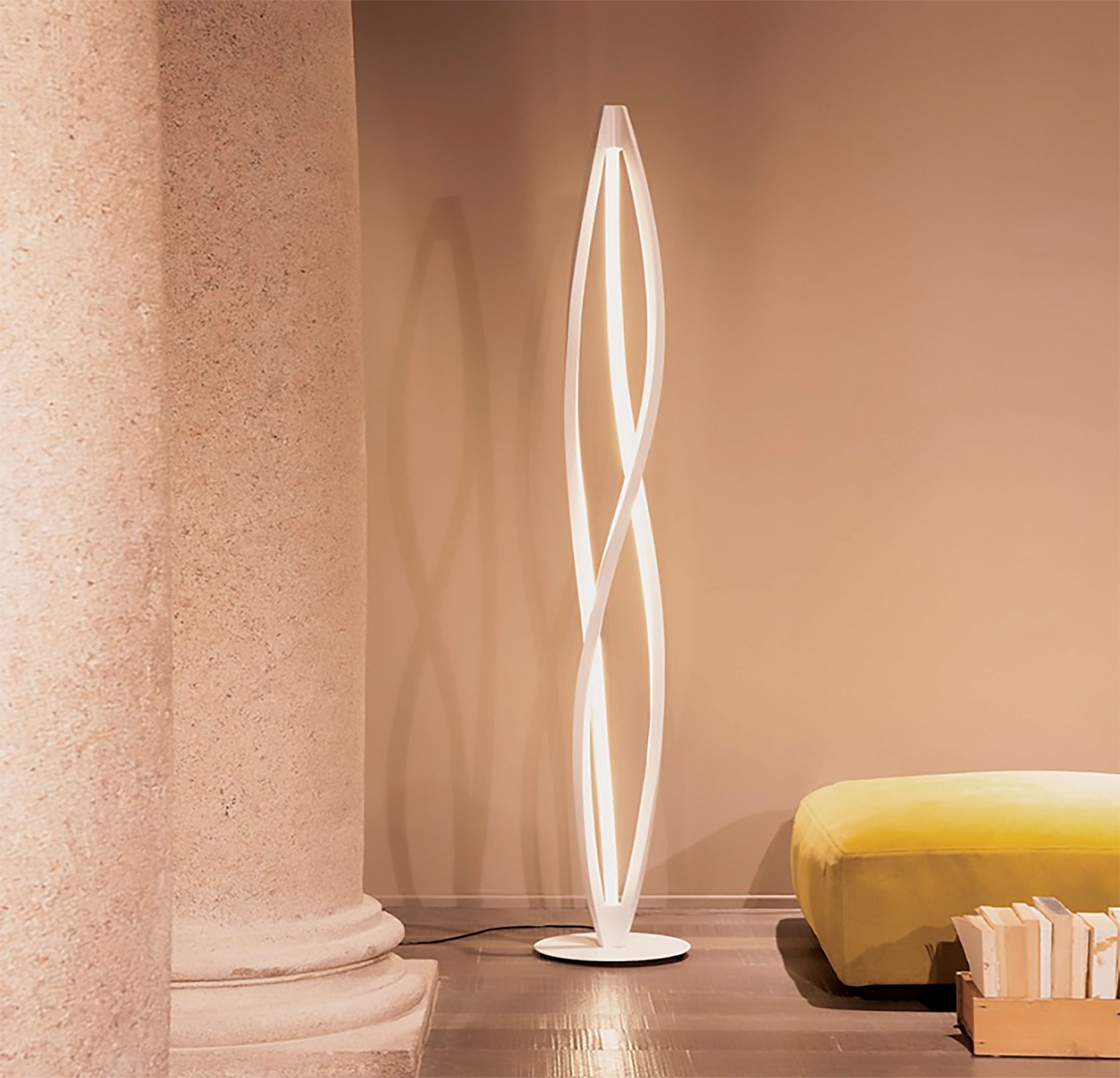 Lámpara de piso con LED integrado, Material: Metal y acrílico, Watts: 76W, Temperatura de color: 3000K, Flujo luminoso: 6080lm, Voltaje: 90-130V, Medidas: ø280*H1830mm.