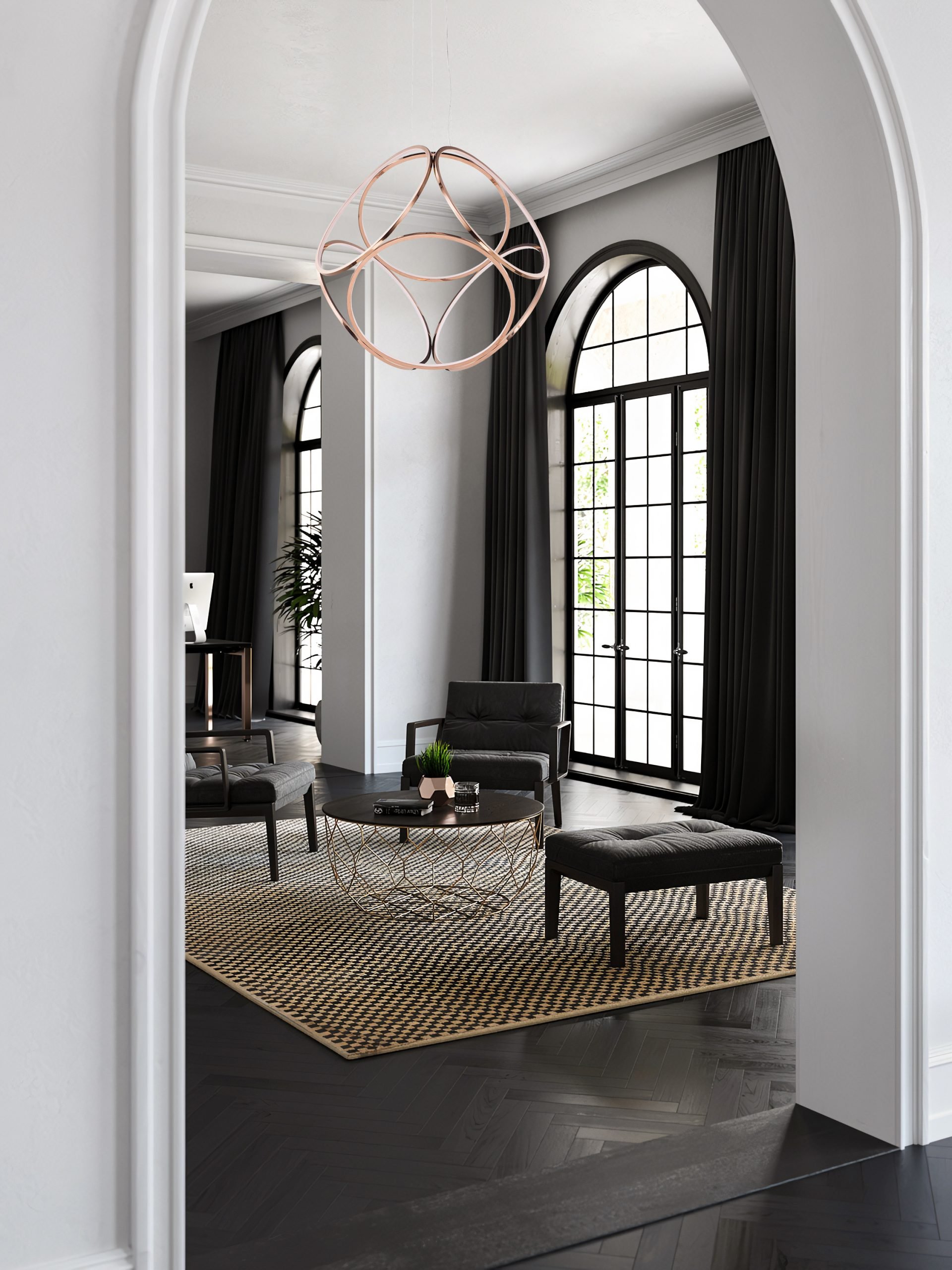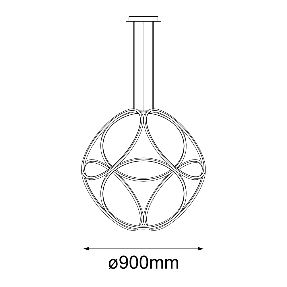 Pendant con LED integrado, Material: Aluminio PC, Acabado: RG – Oro Rosa, Voltaje: 90-130V, Watts: 100W, Flujo luminoso: 8000Lm, Temperatura de color: WW 3000K (Luz Cálida), Medidas: Ø 900mm, Cable de 3m.