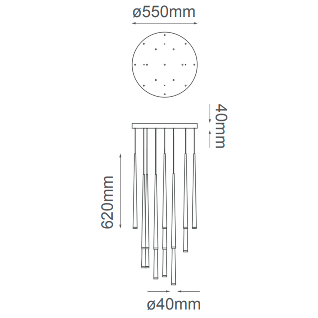 Pendant con LEDs integrados de 15 luces, Material: Aluminio y acrílico, Acabado: BK – Negro, Watts: 90W, Temperatura de color: 3000K, Flujo luminoso: 7200Lm, Voltaje: 90-130V, Medidas: W550*H620mm, Altura ajustable: cable de 3m.