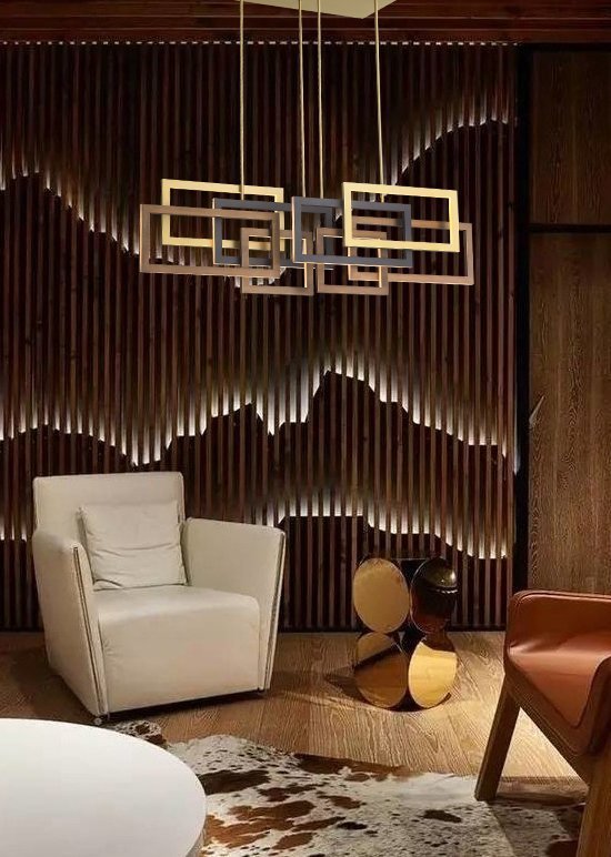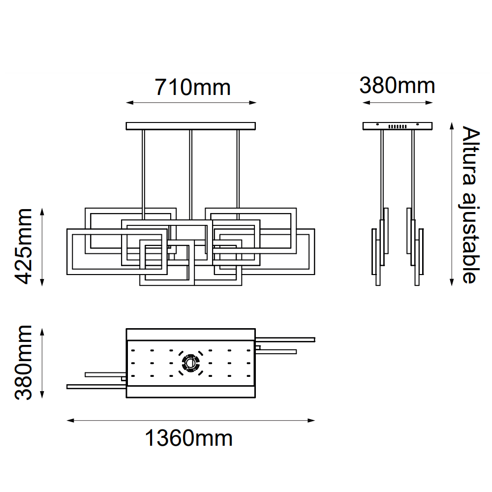 Pendant con LED integrado, Material: Aluminio Hierro Acrílico, Acabado: GD – Oro, Voltaje: 90-130V, Watts: 64W, Flujo luminoso: 5210Lm, Temperatura de color: WW 3000K (Luz Cálida), Medidas: L1360*W380*H425mm, Altura ajustable: 40 tubos de extensión, 8 (45cm), 12 (35cm), 12 (25cm) y 8 (15cm), Peso: 10kg.