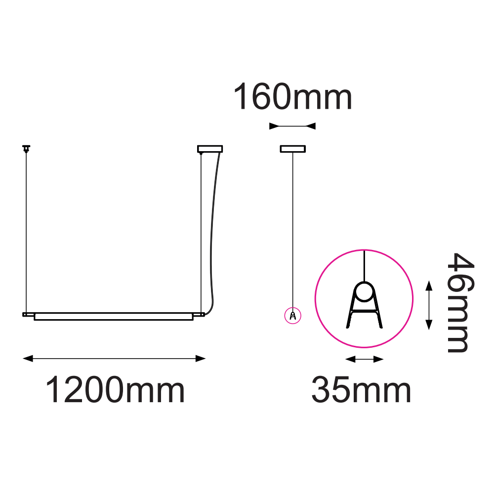 Pendant con LED integrado, Material: METAL, Voltaje: 90-130V, Base: LED integrado, Watts: 21W, Flujo luminoso: 2000lm, Temperatura de color: NW 4000K (Luz Neutra), Medidas: L1200*W35*H46mm, Cable de 3m.