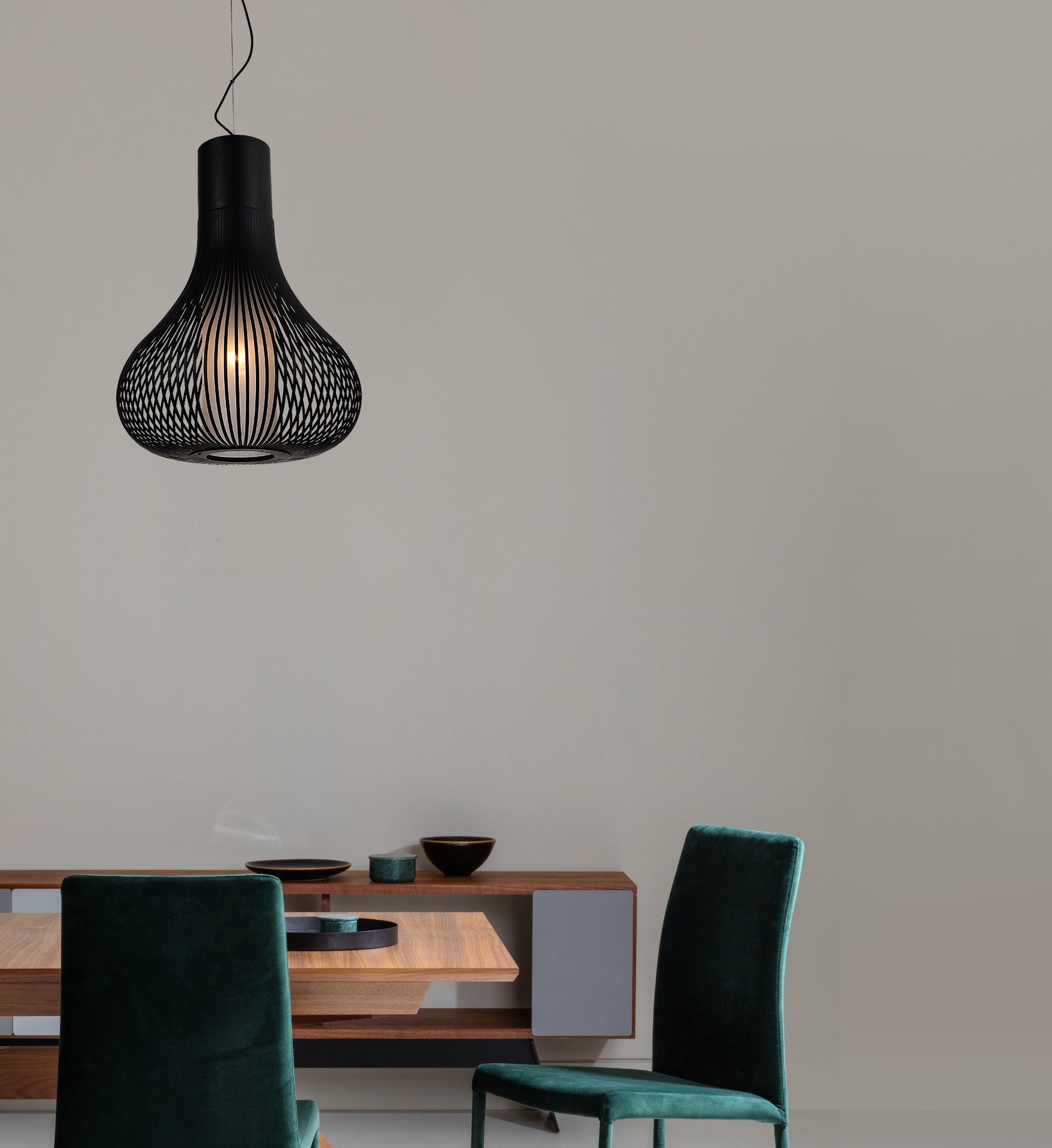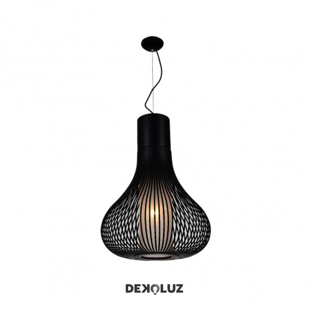 Pendant con salida para un foco, Material: Metal y Cristal, Acabado: BK – Negro Mate, Base / Watts: E26, 1*40W, Voltaje: 90-130V, Medidas: ø320*H390mm, Altura total: 3m, Peso: 3.2kg, Foco no incluido.