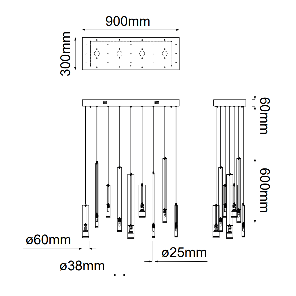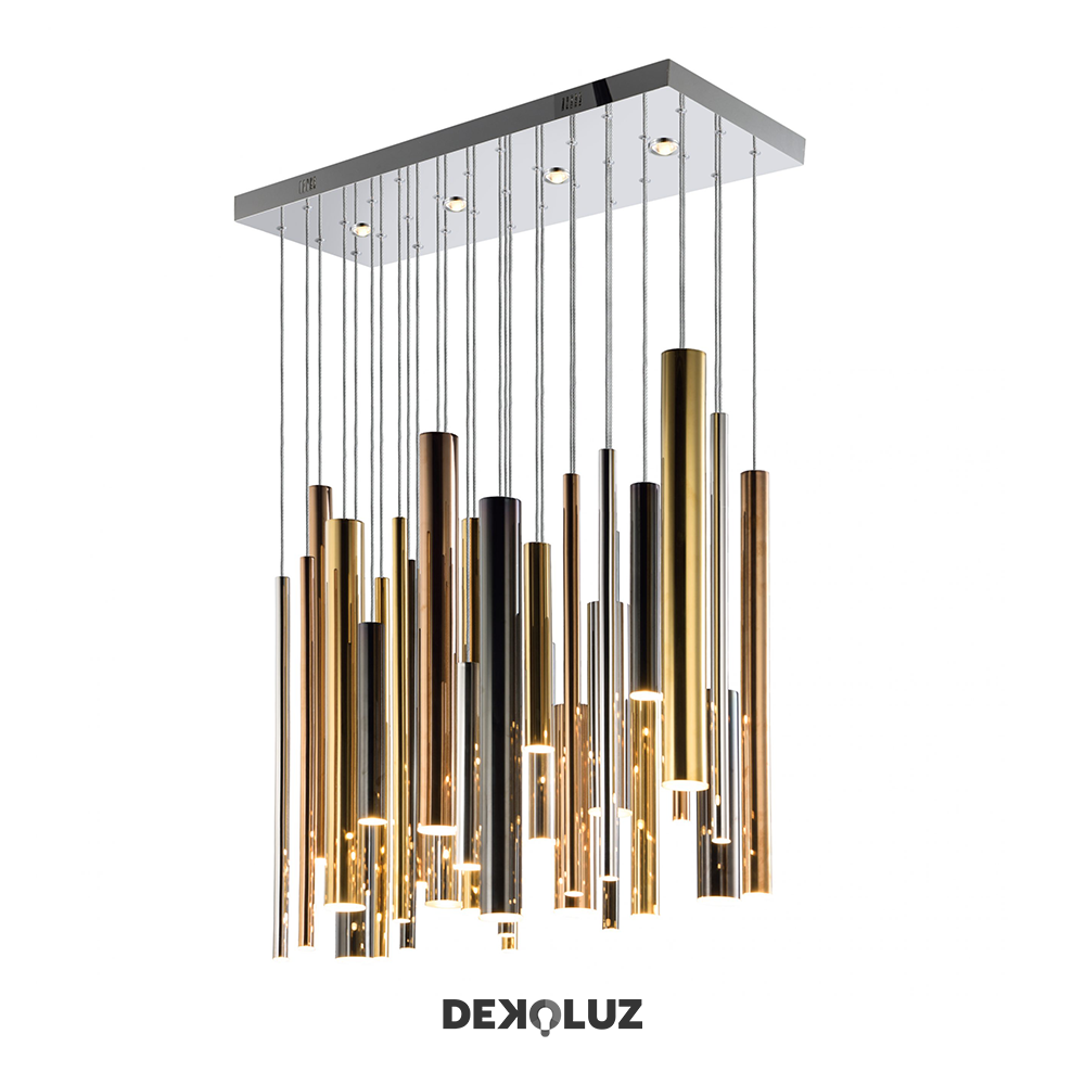 Pendant con salida para 35 focos, Material: Aluminio, Acabado: CRB – Oro, Cromo, Oro Rosa y Negro Cromo,Voltaje: 90-130V, Base: 14*GU10 21*G9, Watts: 35 Luces*4.5W, Medidas: L900*W300*H660mm, Altura total: 3m, Focos no incluidos, Solo usar focos de LED.